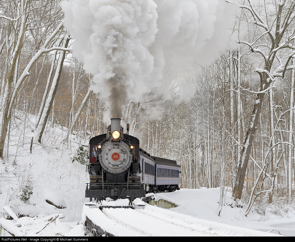 | #98 pulls a short passenger train through the "S" curve at Bridge 10C. The wet, heavy snow combined with the heavy Pullman cars made it a challenging day for the engineer. Thanks to the WWRR Crew and Lerro Productions for putting on a great event despite some unexpected challenges early in the day. |