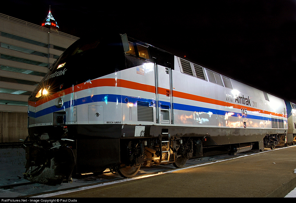 | Leading it's first train since being painted into the Phase III Heritage Paint scheme, Amtrak 145 takes a break at the Cleveland Depot at 2:40 a.m. en route to Washington on the Capitol Limited. |