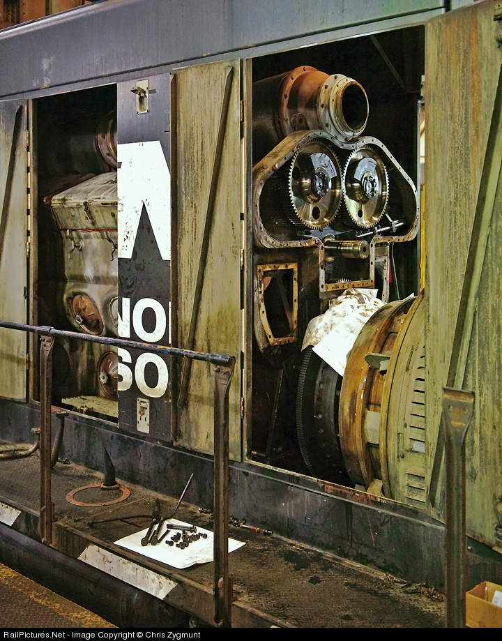 A mechanic has his tools laid out on white paper so it's easier to find. He also has a piece of railing removed for ease of access. This mechanical work is being done at the Conway diesel shops.