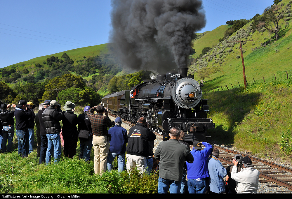 | Someone has to be the last person off the train for a photo run, and in this case it was me. So instead of fighting to crowd in the line, I decided to document the event. SP 4-6-2 2472 struts her stuff for the cameras near Niles, Ca on a beautiful spring day. |
