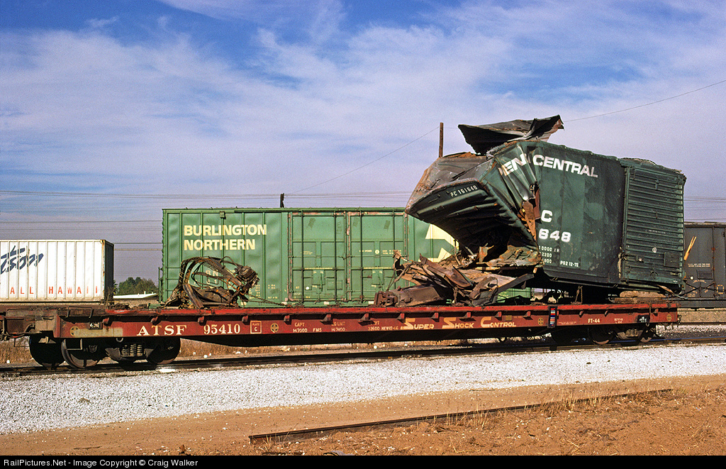 are still being cleaned up on November 4, 1974. The remains of Penn Central box car 151648 have been loaded onto Santa Fe flat car 95410 so that the PC car can be sent to the scrapper.