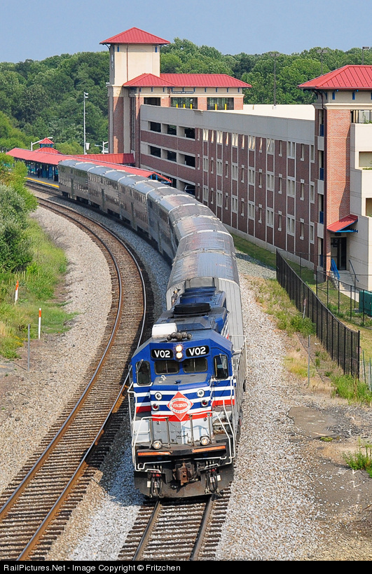 Led by VRE's V02, an ex-Seaboard Air Line RP39-2C, the southbound P327 commuter train pulls out of Burke Centre station on its way south to Broad Run.