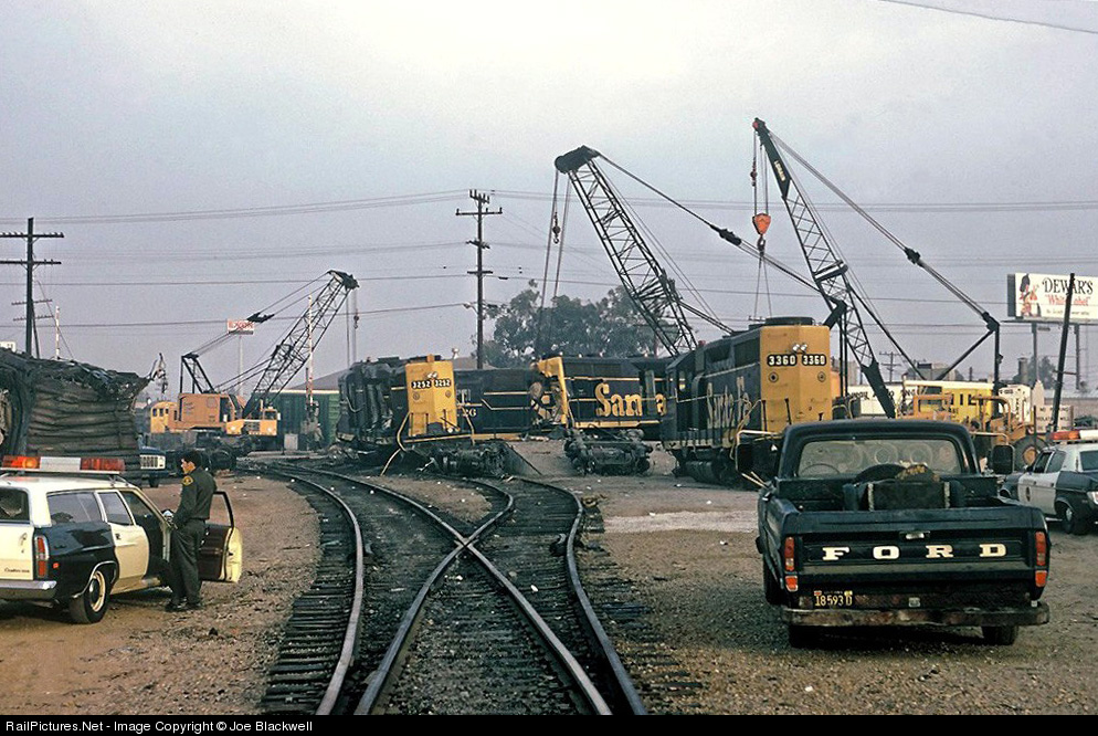 Probably the worst accident to happen on Santa Fe's Harbor District occured on November 11, 1973 when a switch into an industry was lined by vandals diverting the Wilmington Turn into the spur where it hit a boxcar pushing it off the end of track then across a street hitting a couple of automobiles behind the lowered gates resulting in a number of injuries, two fatalities and four engines and two cars off the tracks.