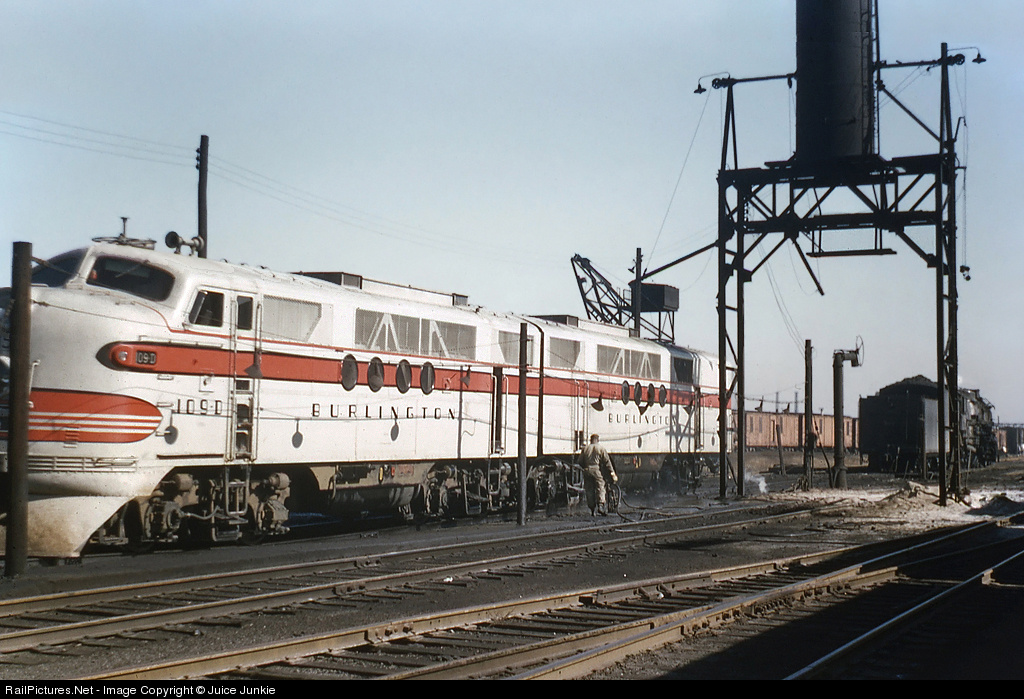 In the waning days of steam, we made several trips to Burlington's Clyde Yard in Cicero to find steam survivors. On this beautiful sunny day we also saw steam's eventual replacement, EMD FT AB 109D being serviced with CB&Q 5617 in the background. Today all is well for the big northern as she waits for her next assignment. Image 349555 shows CB&Q 5617.