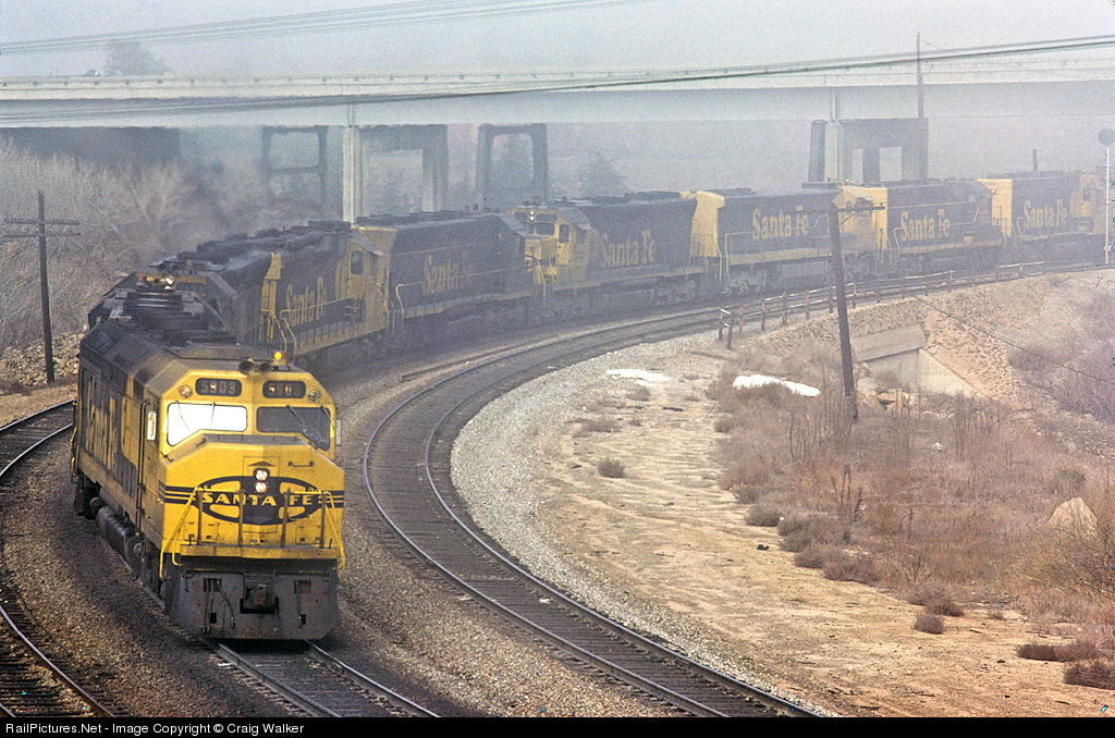 | It takes a lot of power to lift heavy trains over the Tehachapi Mountains, as evidenced by this Santa Fe eastbound lead by F45 5903. Ten six-axle diesels from factories in La Grange IL and Erie PA are on the head-end on a foggy December 23, 1978 - all struggling against the force of gravity. |