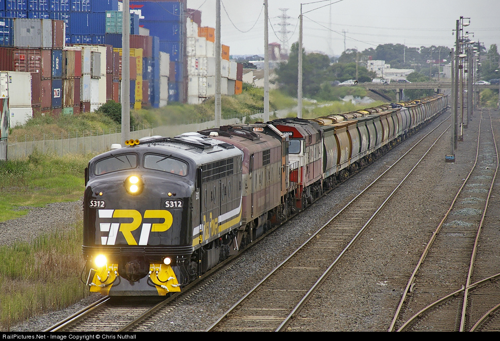 The latest Bulldog reactivated in Australia is the just 50-year old former Victorian Railways S312, returned to service by Rail Power at Goulburn, NSW, now at work in Victoria on hire to El Zorro. With ditch-lights ablazing, S312 leads GM36, T386 and 44209 through Brooklyn on an empty grain train.