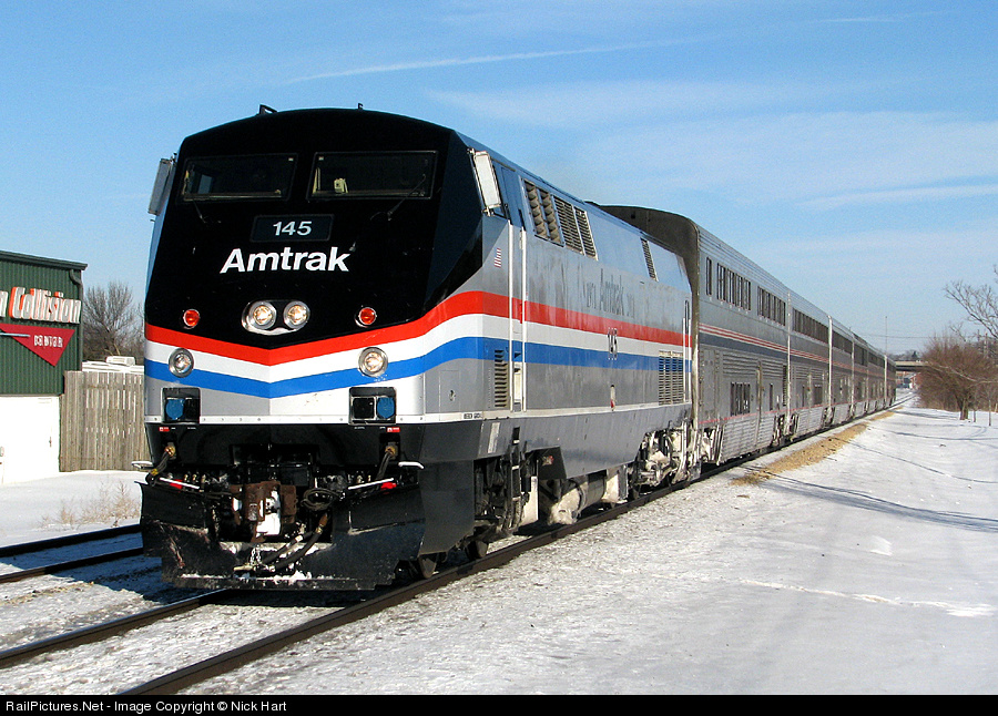 | Amtrak 145, a P42DC painted in the company's Phase III heritage, rolls through Lemont, on a sunny afternoon. |