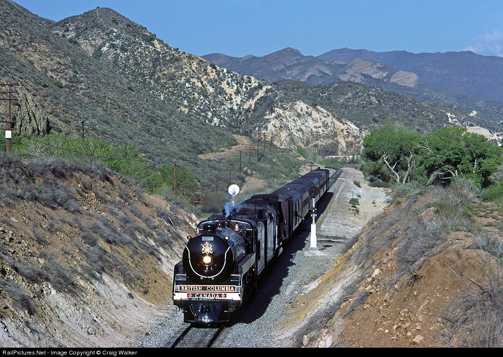 "Royal Hudson" 2860 is a former Canadian Pacific 4-6-4 owned by the province of British Columbia. In March of 1977, the streamlined engine and its train – which normally operated on the British Columbia Railway out of North Vancouver, BC – headed to Los Angeles in order to create interest in tourism to the Canadian province. The seven-car train (plus an auxiliary tender and SP SD45T-2 9307) is seen here heading through Soledad Canyon on its way to Los Angeles. (I have no idea what the blue thing the person in the baggage car is throwing off the train...) (Russ, California – March 29, 1977)