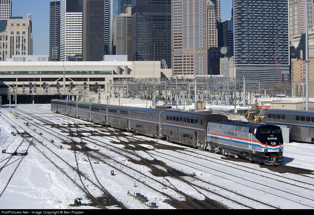 | With an on time departure, AMTK145 (P42DC) in its' new phase III heritage paint pulls the Texas Eagle out of Chicago Union Station |