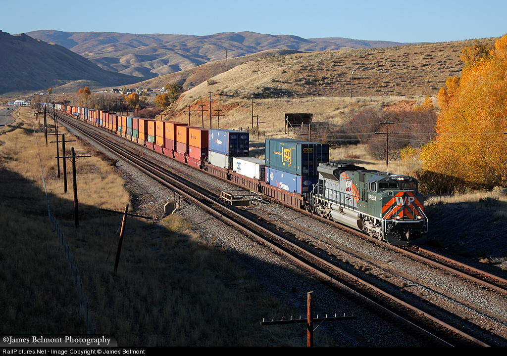 | The Western Pacific Heritage SD70ACe leads Union Pacific's Lathrop, CA to Global 4, IL stack train east at Henefer, Utah. |