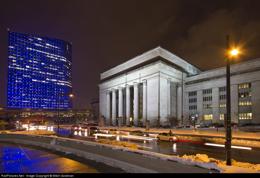 The majestic PRR built 30th Street Station (1933) holds it's own in a contrast of architecture along side the 29 story Cira Center completed in 2005. Seen here the less often photographed rear facade. Both buildings are connected by a walkway which allows easy access not only to the office building but a multilevel parking garage as well.
