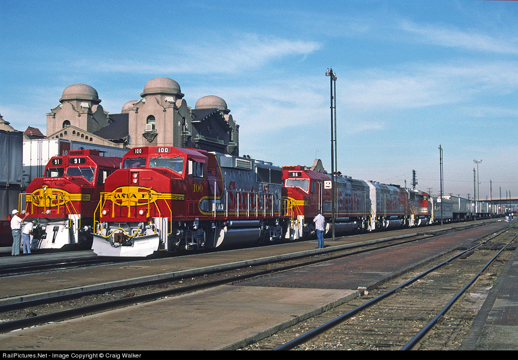 Early in the morning on May 23, 1990, Santa Fe GP60Ms 100 and 101 (spliced with FP45s 96 and 92, as well as business car "Mountainaire") lead train 2-891-23 past FP45s 91 and 90 on a passenger special. The GP60Ms are returning east on their first trip after delivery from EMD. The four-car passenger special would depart later, headed for Cadiz (between Barstow and Needles) and return to try and persuade investors that garbage trains to a proposed garbage dump would be feasible. Click HERE for another shot of the train with GP60M 100.