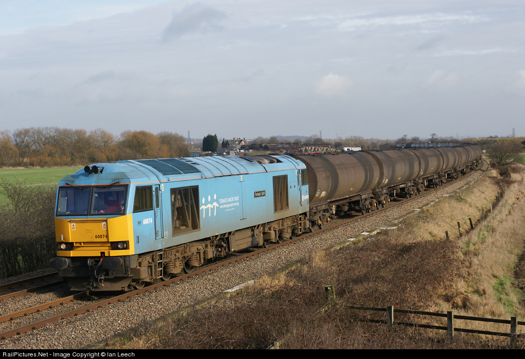 Teenage Cancer Trust liveried 60074 passes Lockington on the Lindsey to Kingsbury fuel tanks.
