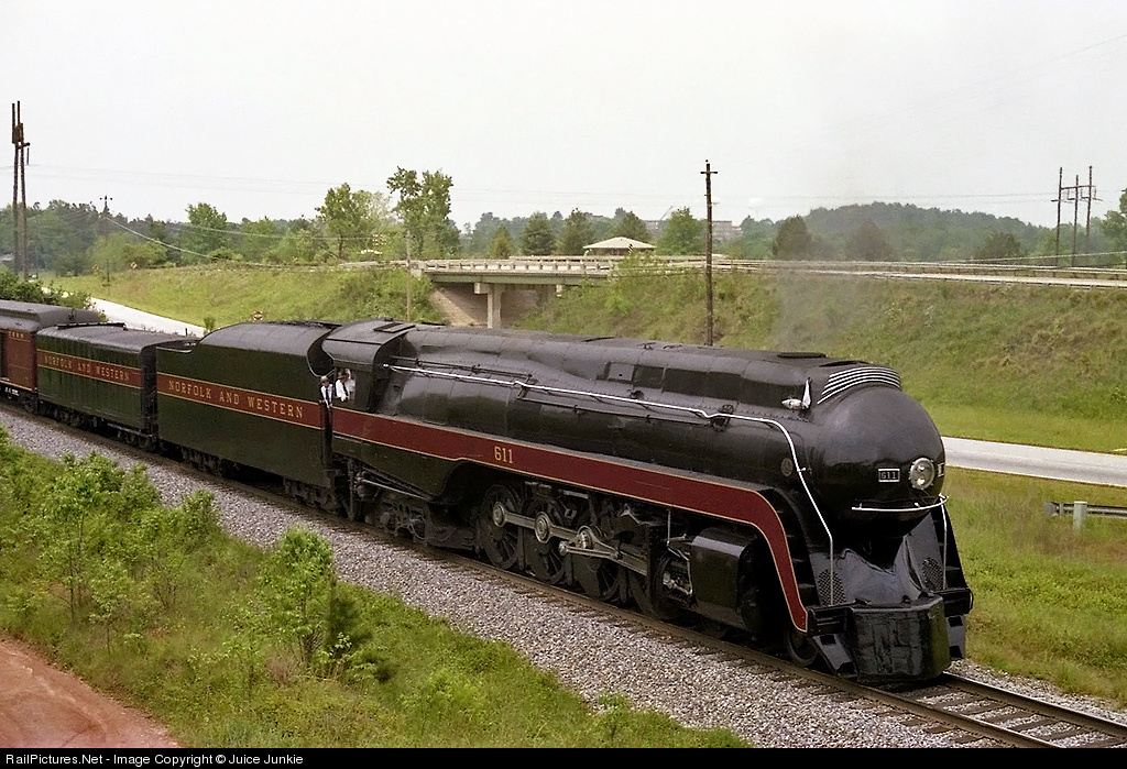 The Spring Steam Special III excursion ran from Atlanta to Toccoa, Georgia, a distance of about 100 miles each way. Norfolk & Western Class J 4-8-4 611 was the power this day, still looking like she had just been released from the Birmingham Steam Shop. N&W 611 was built by N&W in 1950 at Roanoke. She has 70 inch drivers, boiler pressure of 300 lbs, 27 x 32 inch Cylinders, and can deliver 80,000 pounds of tractive effort. N&W 611 is shown backing up for a runby under overcast skies at Alto, Georgia.