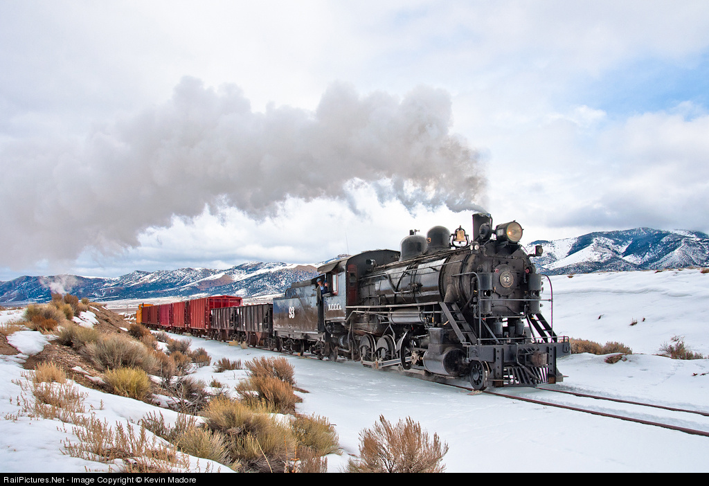 Steam, Snow & Sagebrush. Nevada Northern's Alco #93, lettered for Nevada Consolidated Copper, hauls a hopper train through the shallow cut at Mosier, just about 2 miles north of the East Ely Yards. Behind the train is the vast Steptoe Valley, which extends northward for roughly 100 miles.