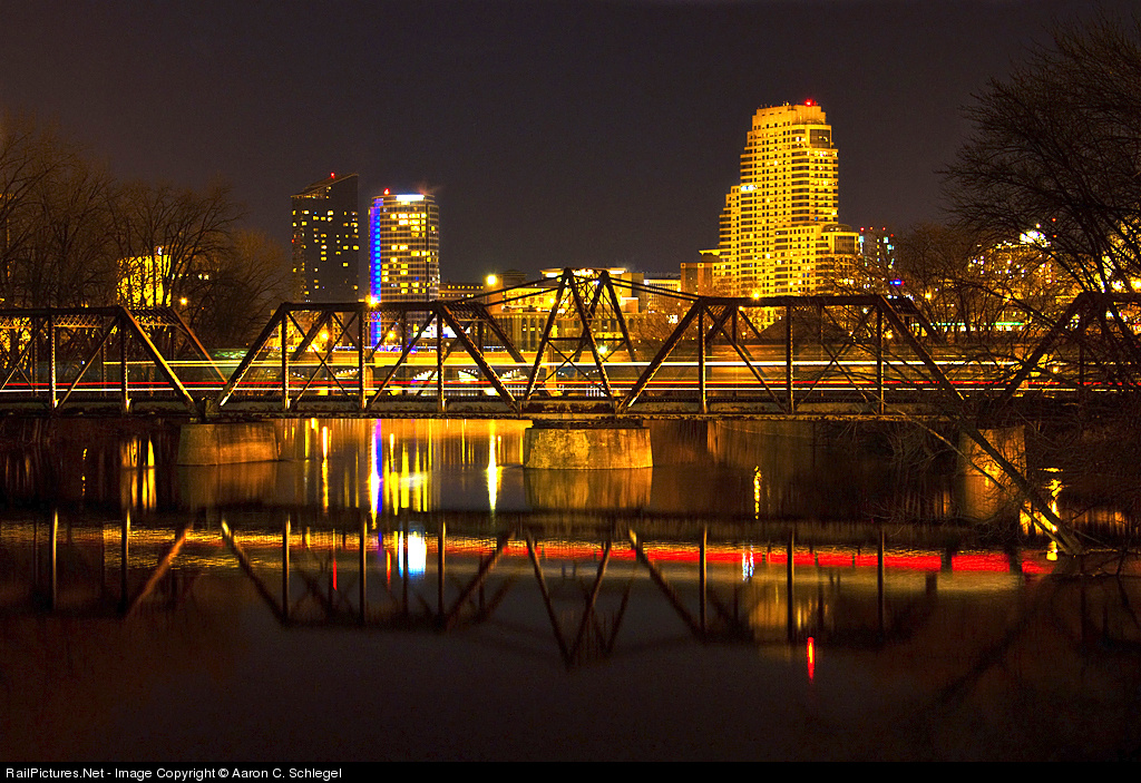 The Pere Marquette pulls across the Grand River in full view of the beautiful city of Grand Rapids sky line. P370 will pull up to the wye at Ann Street to be tied down for the night. It will leave Grand Rapids in the morning as P371 for Chicago.