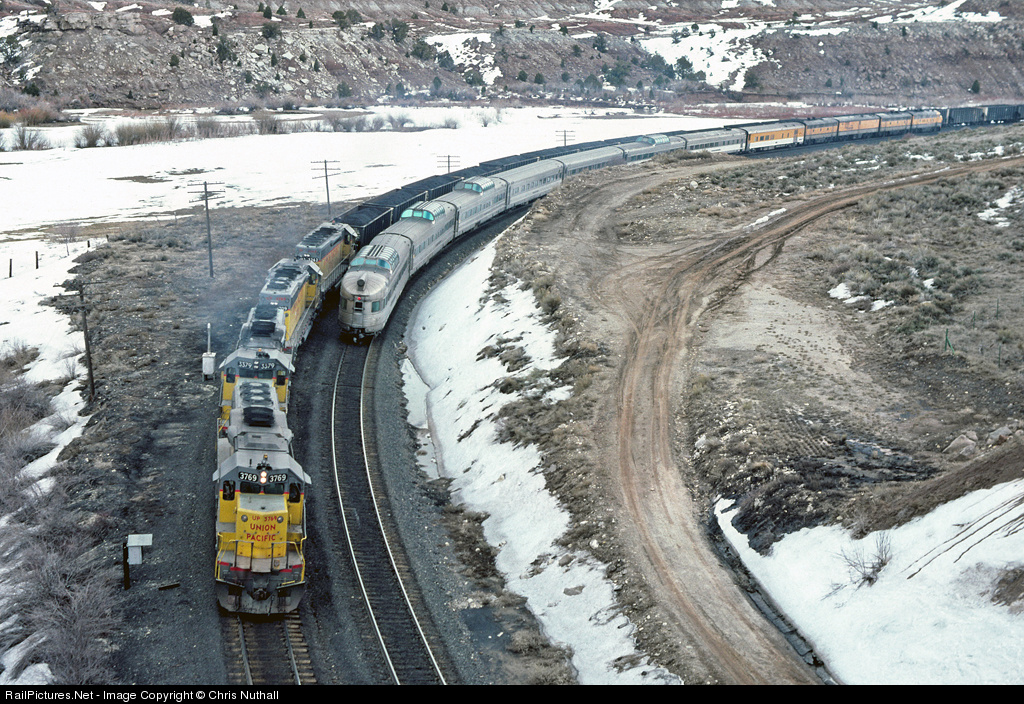 A chance cross, while chasing the eastbound Rio Grande Zephyr from Provo to Helper in March 1982, was with a westbound coal train. Just about to dive under Highway 6 near Colton, 3762, 3379, 3709 and 3262 make their way up to Soldier Summit with the aid of four similar helpers further back the train. The usual suspects are about to disappear right of shot with the RGZ, heading for for the next stop at Helper.