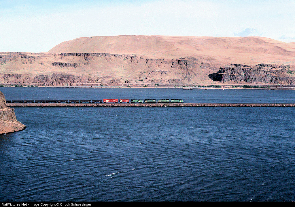 From high above the Columbia River, Horsethief Lake and the huge cliffs on the Oregon side of the river dwarf this BN westbound lead by 2529 along with another GP35,GP30 and an RS11. I had ran out west of Wishram in hopes of getting a train I had been waiting on. That job was powered by a GP35,C425 and a pair of C636's. Instead first up was a westbound grain empty with a pair of SD45's. Then this job which had passed the train I was waiting for at Wishram. I never did get the train I was really after at this spot as it was getting late in the evening and clouds were moving in from the west. After this shot I beat a hasty retreat east and was able to shoot the westbound I was waiting for just as the sun was about to duck behind the clouds near Celio Bridge.