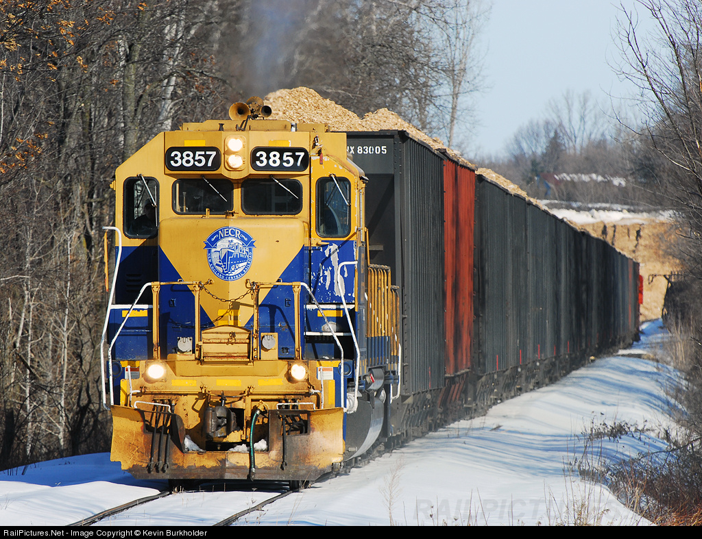 | The NECR 500 "Chip Train" is seen departing the Shelburne Lime loadout for the biomass chips at East Swanton, VT behind the NECR GP38 3857. Visible distantly is the ex-CV wide vision caboose that holds the conductor for the trip down the East Swanton Spur. |