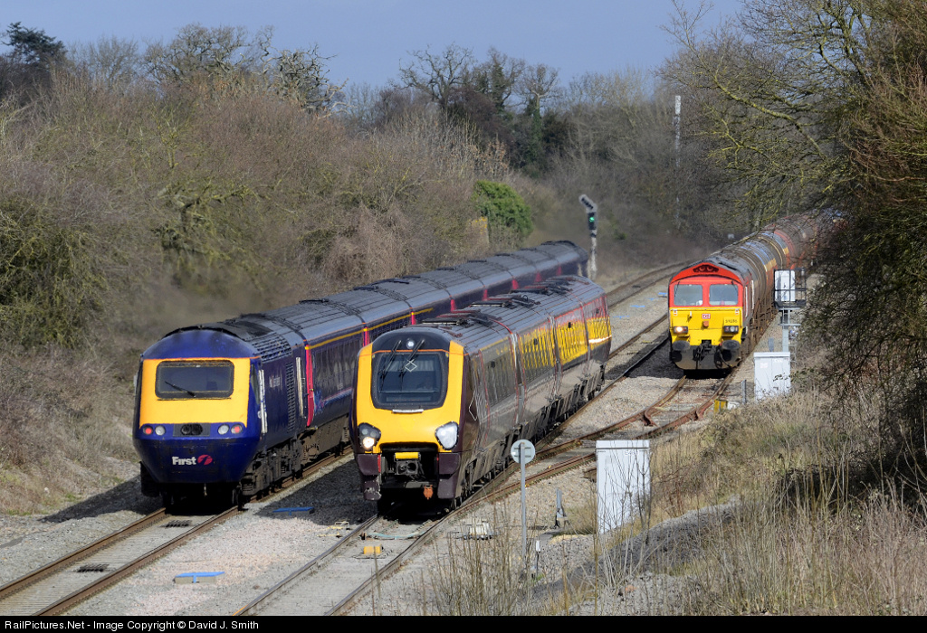 Every so often you manage to get that extra bit of luck - as was the case here. In the centre of the picture,an Arriva Cross Country class 220 unit races towards the camera with a Manchester Piccadilly to Bristol service. It is being passed,on the left of the shot,by the First Great Western 09.48 London Paddington to Cheltenham Spa service,formed by a class 43 High Speed Train. Standing in the Down Goods Loop on the right is the daily 05.05 Robeston to Westerleigh tank train (6B13),hauled by class 59 59206,which will follow the AXC service towards Bristol. Three for the price of one.
