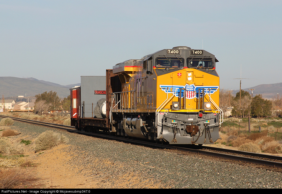 | UP's brest cancer awareness unit #7400 leads a chemical training special from Bakersfield to West Colton seen here passing along the Palmdale Cutoff just south of the Palmdale siding. |