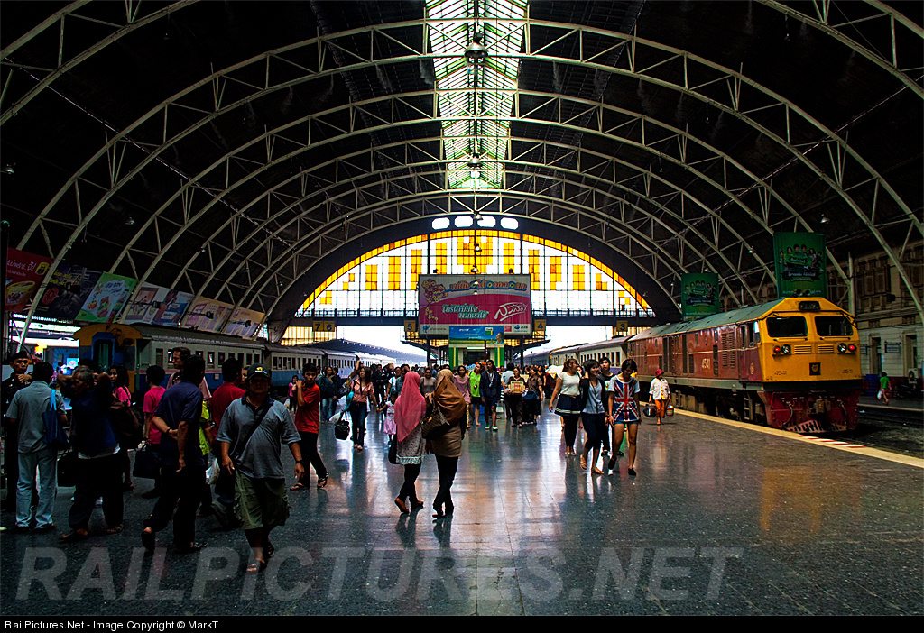 Bangkok's impressive Hua Lampong Station is seen here in an update to George W. Hamlin's 1974 photo http://www.railpictures.net/viewphoto.php?id=197742