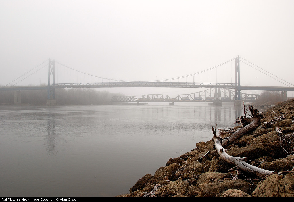 An eastbound UP stack train crosses the old Chicago and NorthWestern Mississippi River Bridge, passing from Iowa to Illinois. This swing bridge was built in 1909 and still sees very heavy use. Although it is double tracked, only one train can cross it at a time. The Union Pacific has plans to replace this old bridge within a few years with a new span that will be high enough that barge traffic will be able to pass underneath it, much like the U.S. Hwy. 30 Bridge here, thereby eliminating a major bottleneck on the extremely busy ex C&NW Mainline. I'll bet the new structure won't have as much character though, and I'll miss watching trains cross the Mississippi on this old stalwart.
