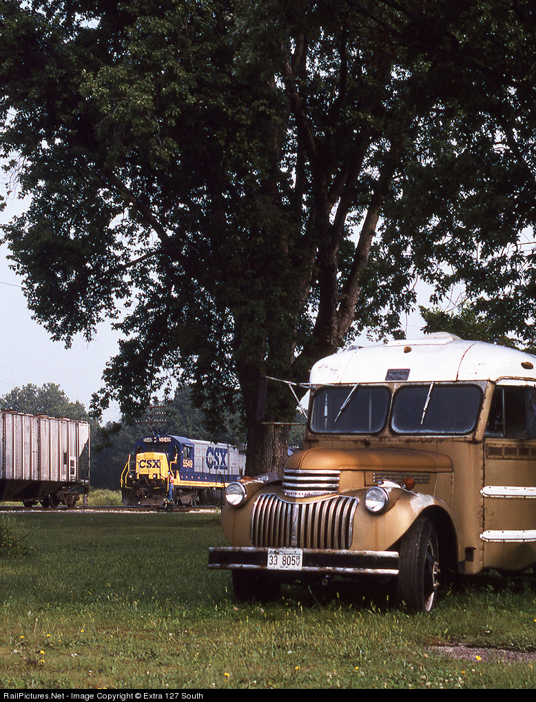 An old Chevrolet school bus, turned camper, stands guard as a CSX local freight couples up after doing some local work in Danville, IL on Sept. 8, 1996.