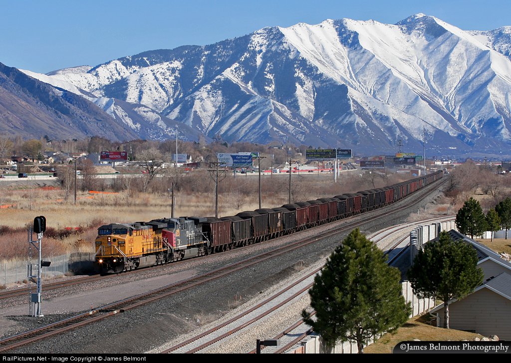 | A Union Pacific Savage coal load heads west through a reconfigured Lakota Junction about five miles northwest of Provo, Utah. Historically this location featured a crossing at grade of Union Paciific's old Provo Subdivision with Rio Grande's double track Subdivision 6 main. Today it features Union Pacific's (ex-D&RGW) double track Provo Subdivision and UTA's new FrontRunner commuter rail line (the two tracks curving off to the right on the old UP right of way). The railroads aren't the only mode of transport undergoing changes here. Interstate 15 (in the background) is in the middle of a rebuild into a super freeway making the chasing of trains through Utah Valley a big challenge to say the least! |