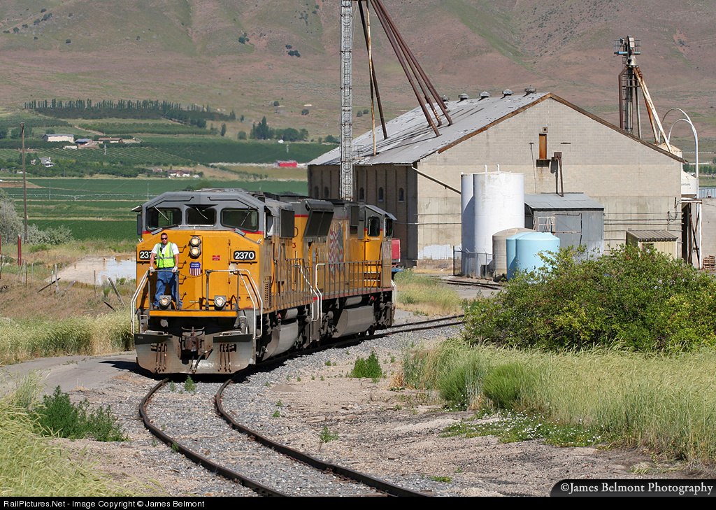 | Power for Union Pacific's LUL57 local moves toward the mainline after setting out a load of fertilizer at the Intermountain Farmers Association Distribution Center at Payson. Historically this spur was built in 1913 to access a brand new sugar factory that was unfortunately shut down by 1924. Payson & Santaquin area fruit orchards are visible along the foothills of West Mountain. |
