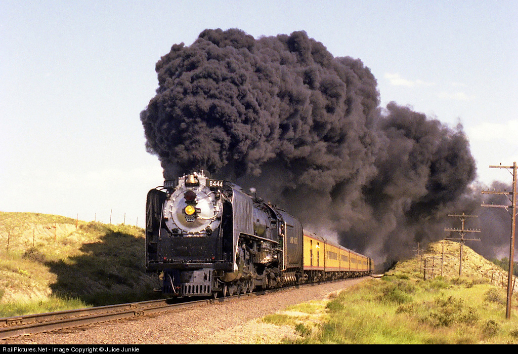 The 1982 NRHS Convention was held in Denver, Colorado. The schedule included an excursion trip from Denver to Sterling and return. Union Pacific 8444 was the power for this trip. Union Pacific Class FEF-3 was built by the American Locomotive Company in December 1944. She has 80 inch drivers, boiler pressure of 300 lbs, 25 x 32 inch Cylinders and can deliver 63,750 pounds of tractive effort. On the mainline, with sunlight on her smokebox, UP 8444 performs yet another runby for the railfans.