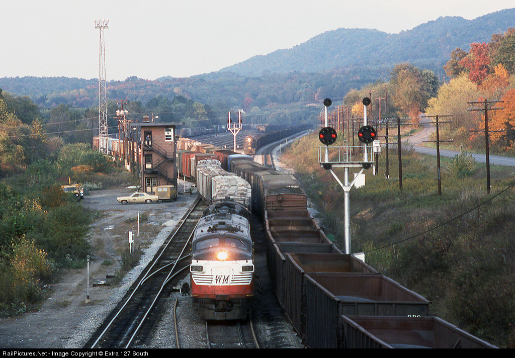 It was train time at Mexico Tower in Cumberland, MD on Oct. 12, 1975. An eastbound WM manifest is leaving the yard as a westbound B&O manifest enters. Waiting behind the eastward home signal is an eastbound B&O coal drag, waiting for traffic to clear to follow the WM train.