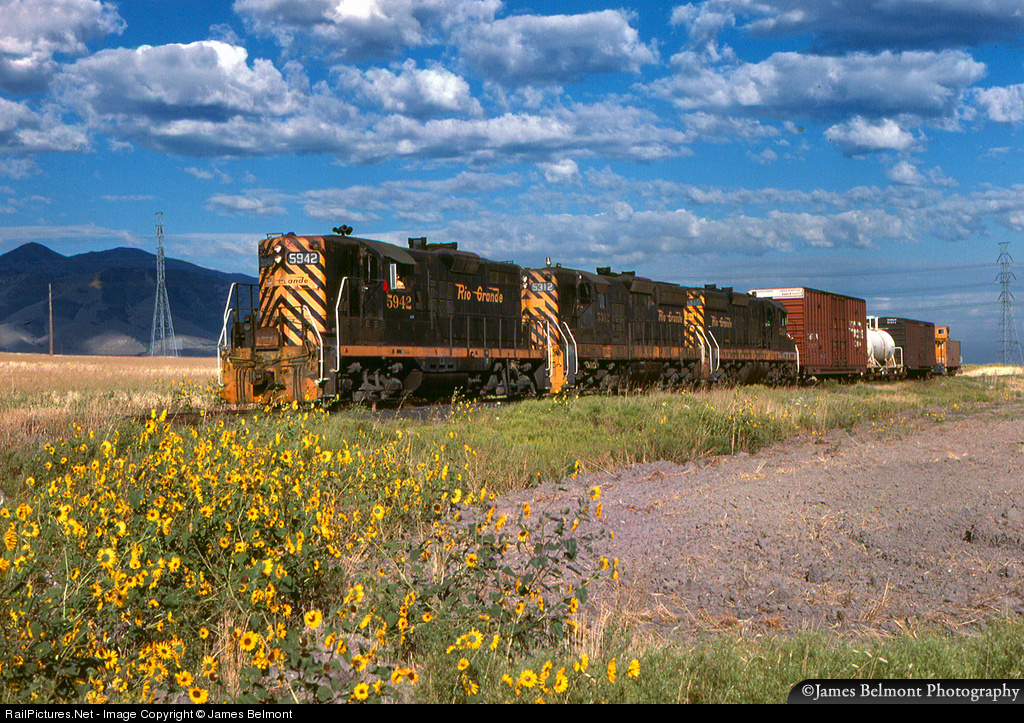 Rio Grande's Midvale Tramp rambles along the Garfield Branch at Bacchus Junction in West Valley City, Utah. This trio of classic first generation EMD's (GP9 5942, SD9's 5312 and 5310) were placed in storage in 1982 only to be brought back into active service in 1983. By 1984 their days were numbered before D&RGW GP30's took over on Utah branchline operations within weeks. If you look closely, scale test car X-450 is coupled just ahead of the caboose. Apparently this line had a marginal traffic base by the fall of 1984. The box cars are loaded with copper concentrate and the tank car carries sulphuric acid.