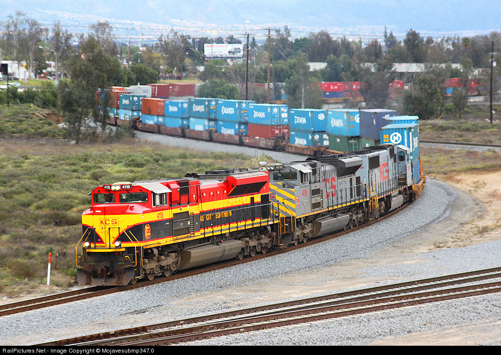 | A solid set of KCS power, which is extremely rare to find in Southern California leads UP train IDILB as it arrives at West Colton lead by Southern Bell 4118. |