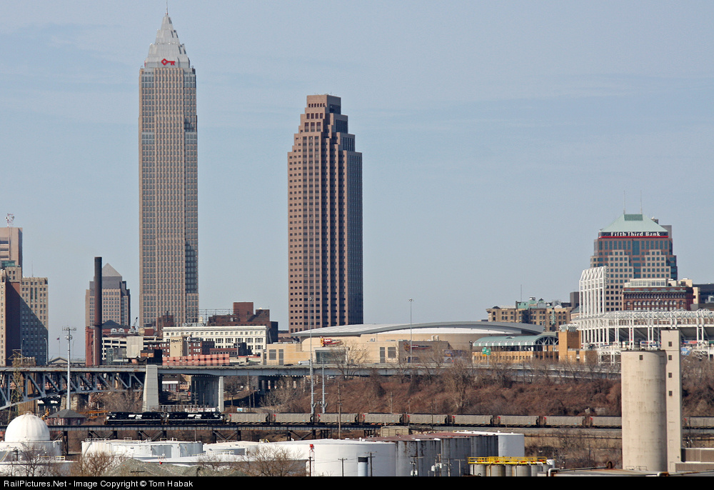 | This train was photographed by lots of people in lots of places on this beautiful day. Here the pair of brand new ACe's lead 554 up the grade just prior to Cleveland Drawbridge, as a scenic part of the Cleveland skyline looms in the background. |