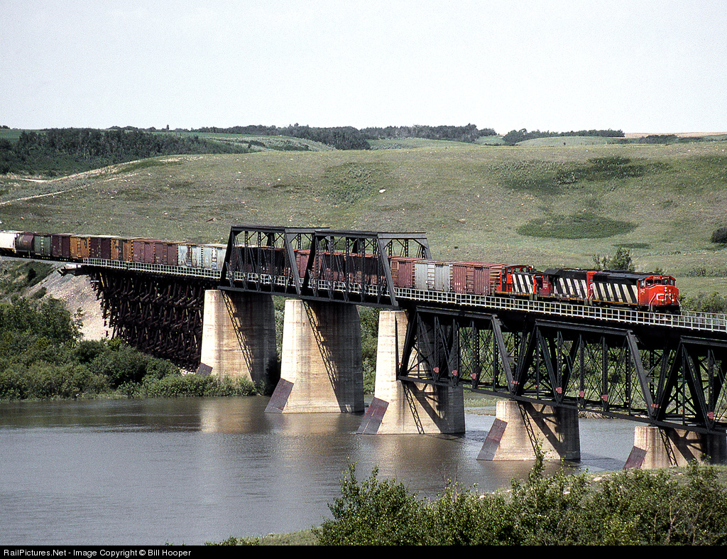 Eastbound mixed freight 354 crosses the North Saskatchewan River on CN's secondary Prarie North Line between Warman and North Battleford
