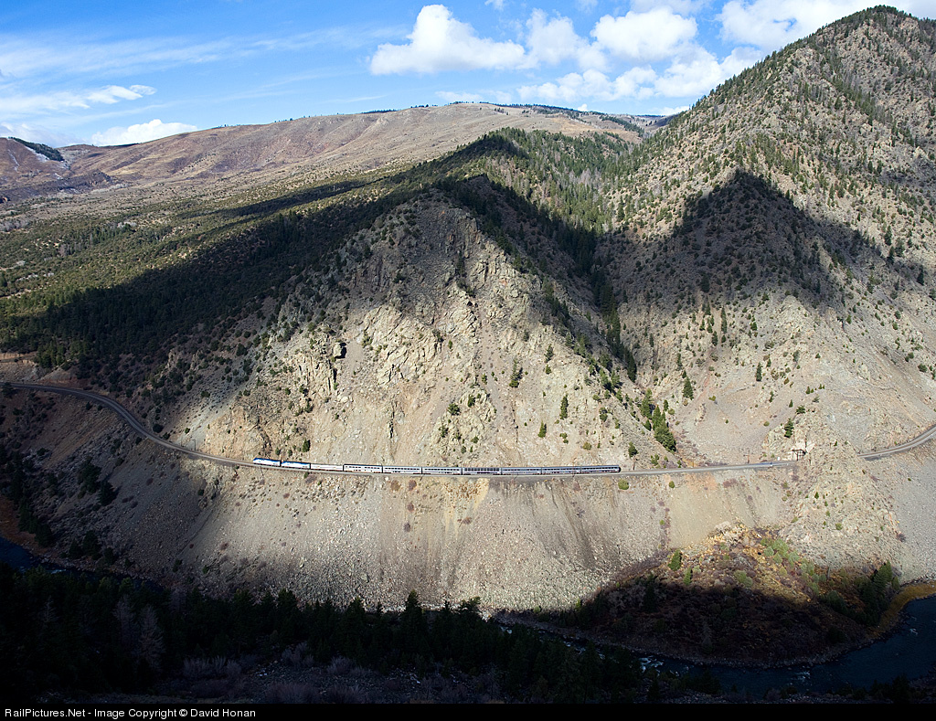 | Riders on Amtrak's California Zephyr get treated to some of the most amazing scenery in the West on a daily basis. Late on Halloween morning, No. 5 demonstrates proof of that statement as it sweeps through the last curves of Gore Canyon and approaches the east switch at Azure. |