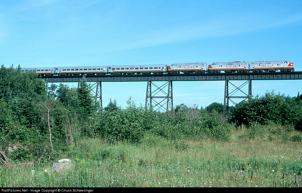 | FP9's 1752,1750,1753 have northbound train 3 crossing Bellevue trestle. Departing Sault Ste. Marie about 8AM the Agawa Canyon Tour Train was a good chase as far as Searchmont. |