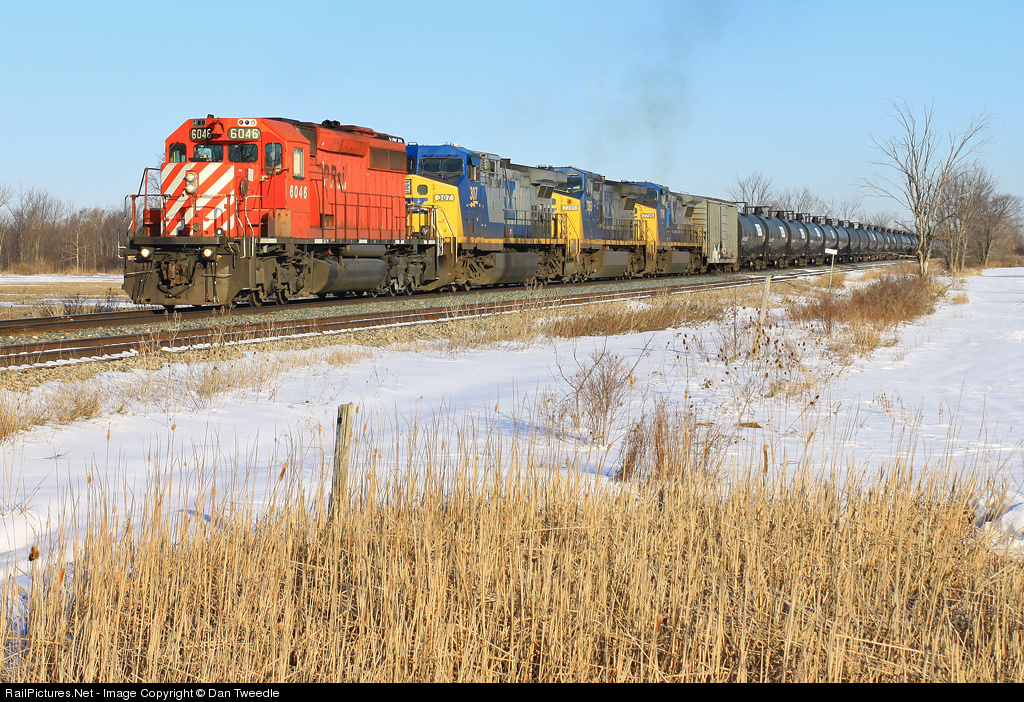 | FPON! Three CSX GEs hide behind CP 6046 with 10,233 tons of loaded unit ethanol train behind them. The CSX numbers include: 307, 7395, and 7796. |