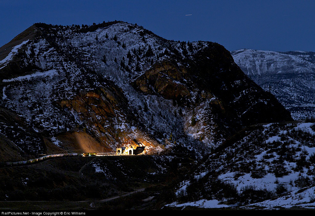 A bright moon illuminates the struggle of machine against the mountain. In this case, the mountain won. With two units on the front and a single DPU on the rear, this train could not make it up the hill and came to a stop outside the tunnel. The crew had to wait over two hours for a three unit pusher set to come from up from Provo and start the battle all over. While waiting, the California Zephyr came through the left bore to help illuminate the scene.
