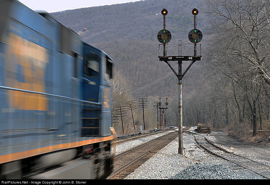 An eastbound coal train roars by the eastward automatic signal at Hansrote, WV, 3/20/11. These vintage B&O CPL's are on borrowed time, soon to be replaced. Spring M/W season has also arrived, as witnessed by the used tie pile on the south side of the tracks ahead.