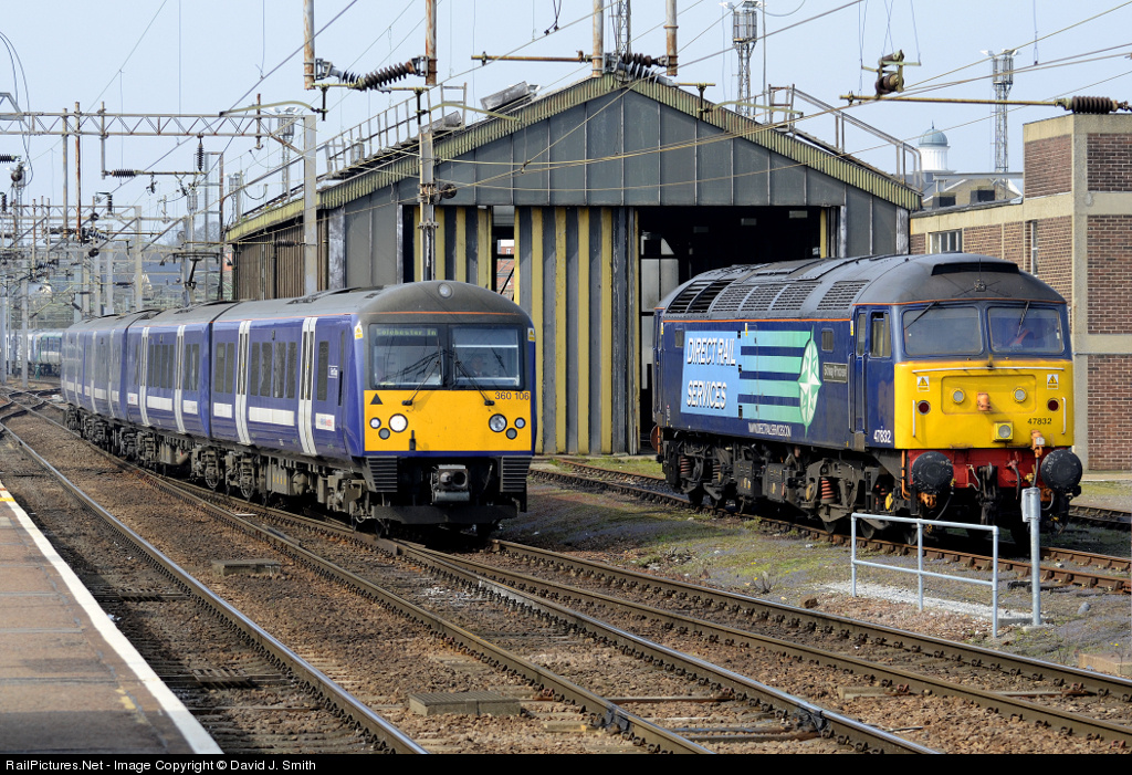 | A class 360 Desiro electric unit approaches Colchester station with a local working,passing Direct Rail Services class 47 no. 47832 stood on the small stabling point. |