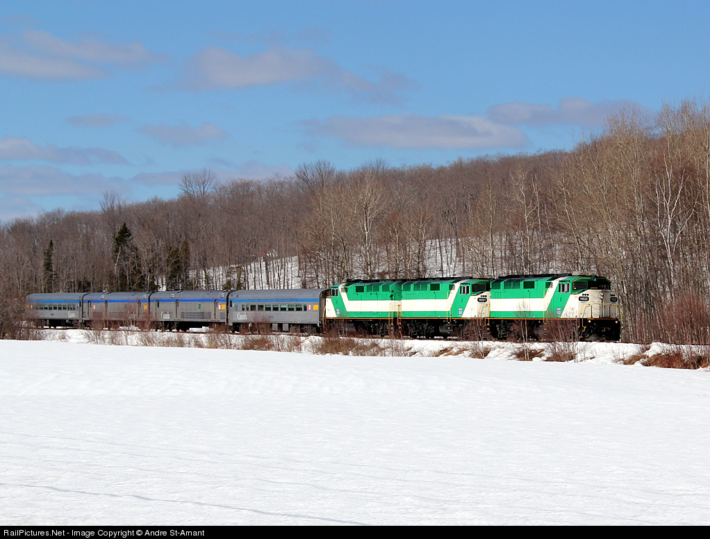 The 'combined' VIA train, to Jonquière and Senneterre, from Montreal, is heading to its next stop, Shawinigan, with 3 Locos (leased), 2 baggage cars and 2 coaches. One will say that this train is 'overpowered'. The reason is that the train to Jonquière has been requiring 2 locos for at least 8 months, since the turntable in Jonquière, to turn the locos, is not 'operational', and it seems that CN does not want to repair it.