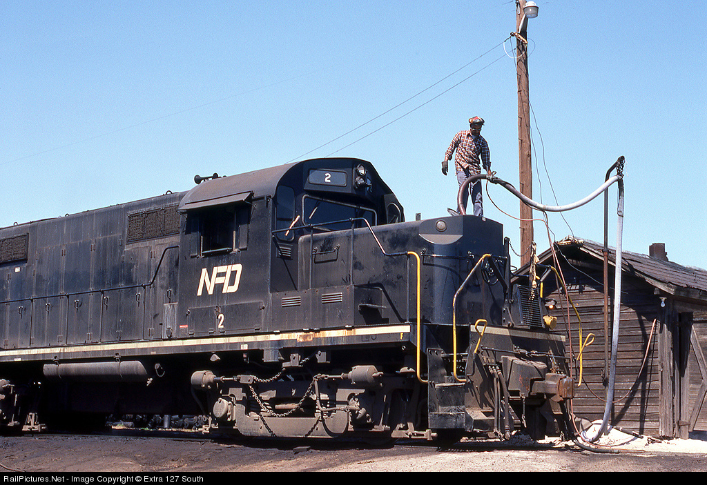 NF&D Alco RS-36 No. 2 was fresh in off a run from Danville when it was being serviced at Lawrenceville, VA on March 26, 1977. The locomotive sanding operation on the NF&D was an exercise in physical labor. Sand was delivered "wet" in low side gondolas. It was shoveled by hand onto a conveyor and transported to a holding area by the sand house. Then, it was shoveled by hand into a coal fired drying stove, where the sand was dried. As it dried, it fell out of the sides of the stove. Finally, the dried sand was shoveled by hand into a tank that used the locomotive air to propel it into the locomotive. Anyone that has ever experienced a Southside Virginia summer can attest that there would be far better places to be, than drying sand in the sand house at Lawrenceville.