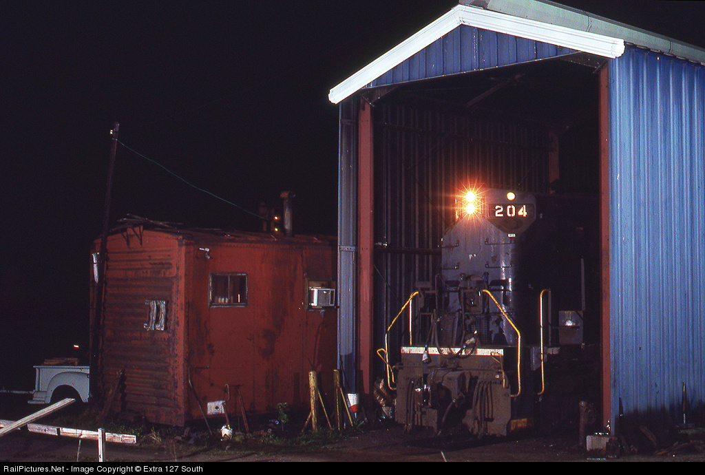 Many a short line led a hand-to-mouth existence. Norfolk, Franklin and Danville and its predecessor, the Atlantic and Danville, surely fell into this category. Before N&W purchased the A&D and changed the name, the old A&D boxcar and an inspection pit were the extent of the shop at Lawrenceville, VA. N&W added a metal building that kept the two man shop force out of the elements, but neglected to add doors. When the wind blew, it was like a wind tunnel. On the evening of April 23, 1980, RS-11 No. 204 was resting in the shop. A sharp eye can barely see the faded Atlantic and Danville lettering on the boxcar.
