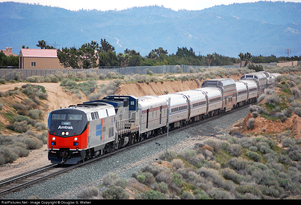 Its climb up Cajon Pass completed, Amtrak “Heritage” P42DC 156 and its train, the Pacific Railroad Society’s 75th Anniversary special operating from Los Angeles to Bakersfield, passes through Hesperia, California, on April 2, 2011. The second engine in the consist is Amtrak Dash 8-32BWH 510.