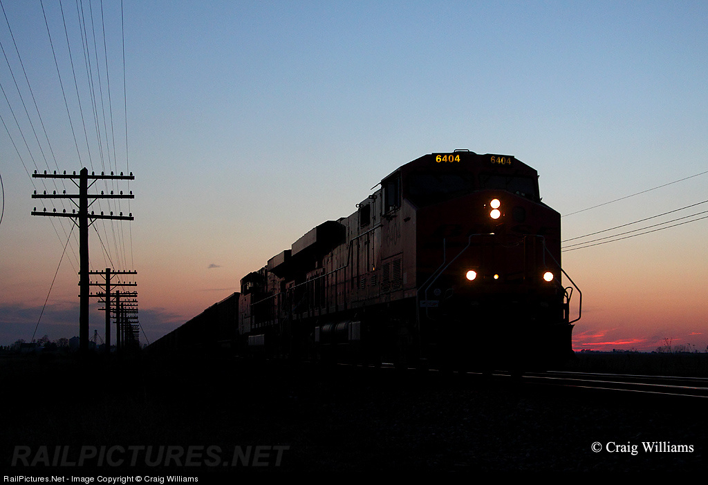 The sun has set on another day as a loaded coal train pounds its way towards Chicago for interchange with an eastern railroad. Telegraph lines/poles and classic CB&Q signal bridges are disappearing in this area at a rapid pace.