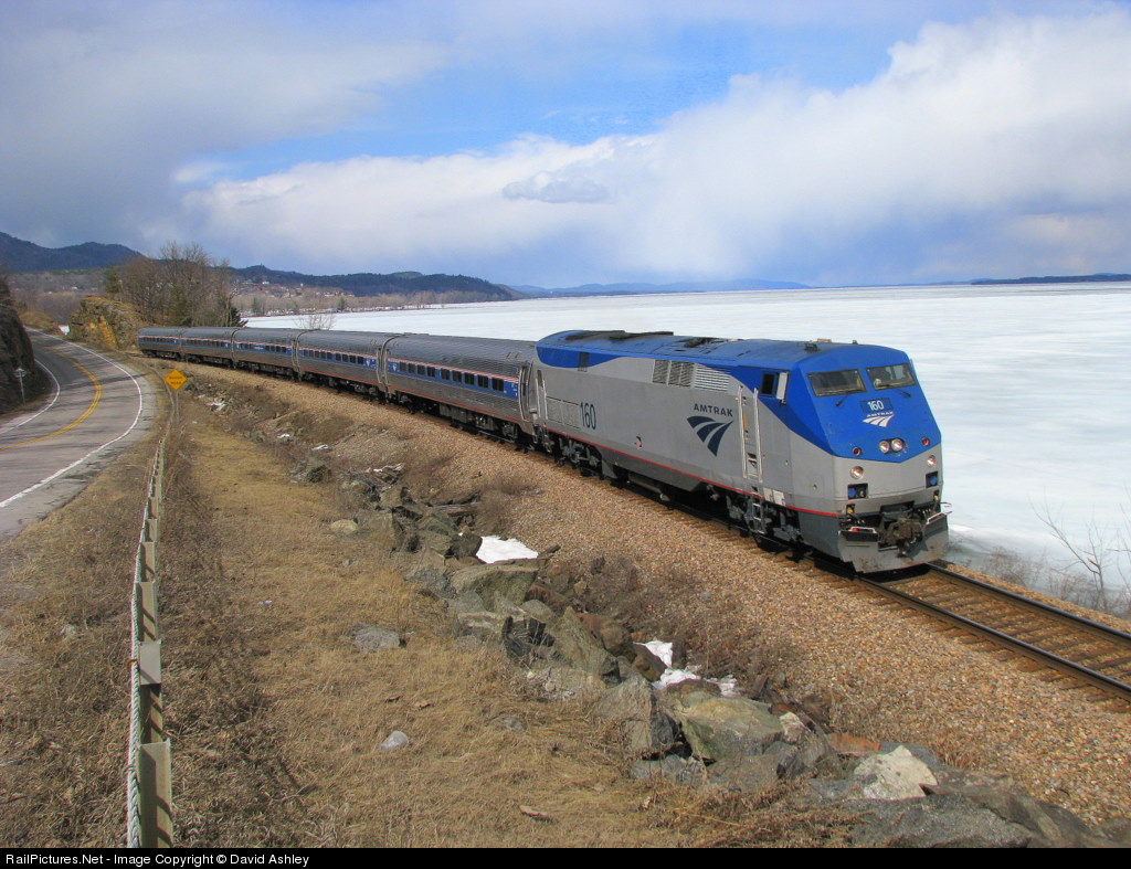 | After making her station stop in town, Amtrak's southbound "Adirondack" heads south alongside State Routes 9N/22 and the west shore of Lake Champlain towards the next stop in Ticonderoga. |