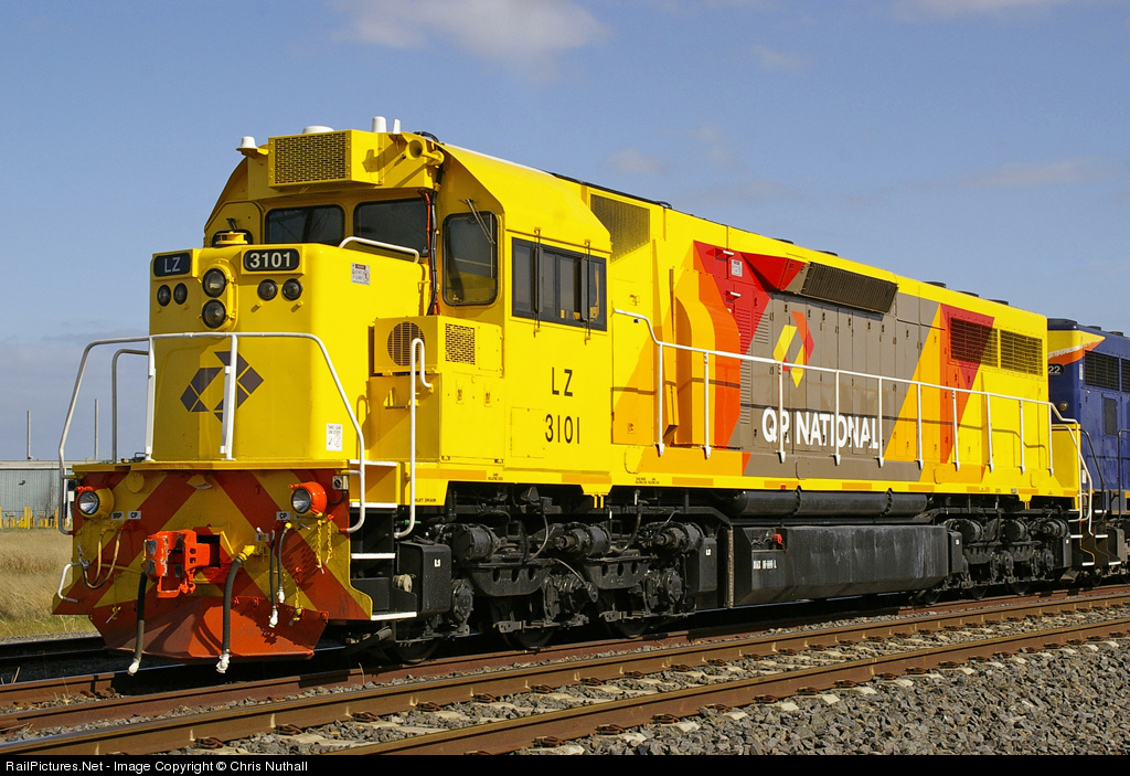 A close up of LZ3101, the Aussie version of the SD40, in the new QR National livery. See photo - http://www.railpictures.net/viewphoto.php?id=359002&nseq=1 - for more details
