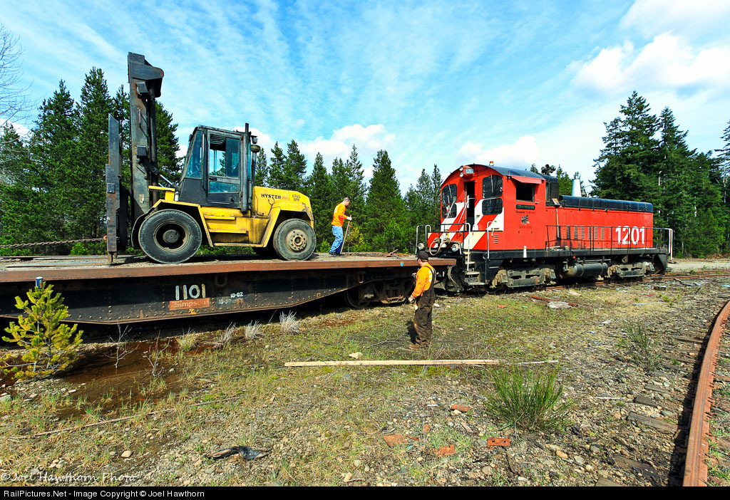 No logs have come in from the water for awhile and the only train today was this move to bring a forklift up the hill from Shelton on a flat car. Here engineer Stick gets ready to unload the cargo as Larry looks on.